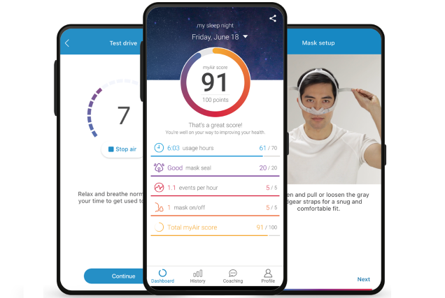 Κάθε συσκευή σας δίνει πρόσβαση στο myAir™ , ένα δωρεάν λογισμικό πρόγραμμα υποστήριξης που συγχρονίζεται με το κινητό σας ή την διασυνδεδεμένη συσκευή σας (tablet, pc). Παρέχει καθημερινό σκορ ύπνου, με άριστα το 100, υποστηρίζοντάς σας και καθοδηγόντας σας, σε κάθε βήμα της θεραπείας.